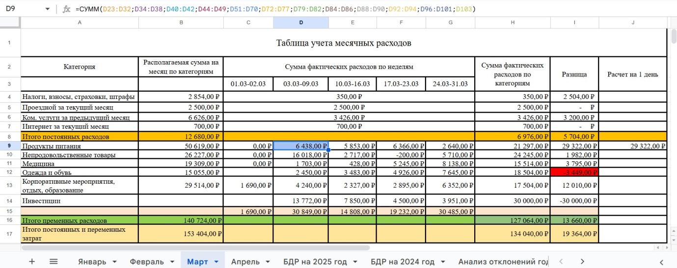 И вот мы, наконец-то, дошли до основной таблицы с указанием конкретных расходов. Для удобства навигации я выделил необходимые ячейки соответствующим цветом. Итак, в таблице учета месячных расходов в ячейке D9 содержится ссылка на диапазоны столбца D. Эти диапазоны выделены светло-розовым цветом. Они отражают сумму, которая потрачена за неделю на товары соответствующей категории.