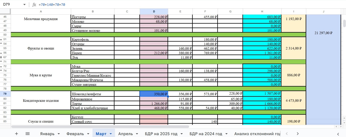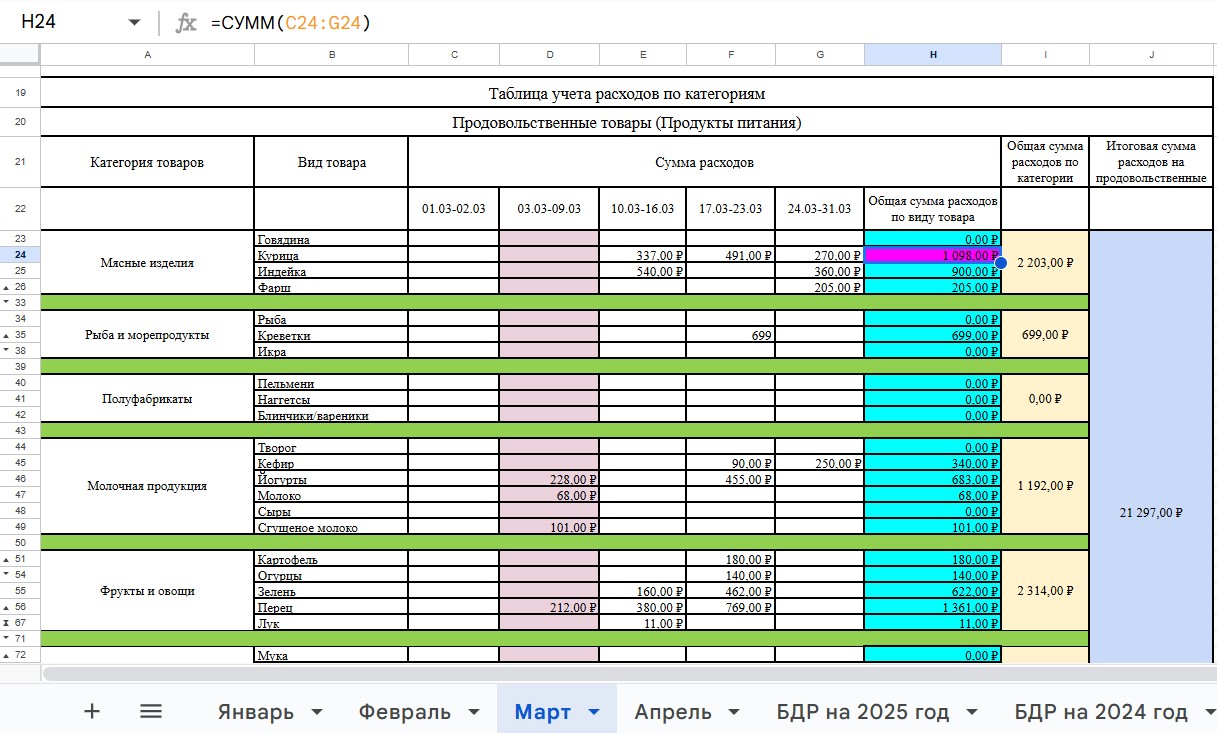 И наконец, последний столбец J, который называется «Итоговая сумма по продовольственным товарам» и окрашен в светло-синий цвет, содержит сумму значений столбца I и отражает то, сколько средств вообще было потрачено за месяц.