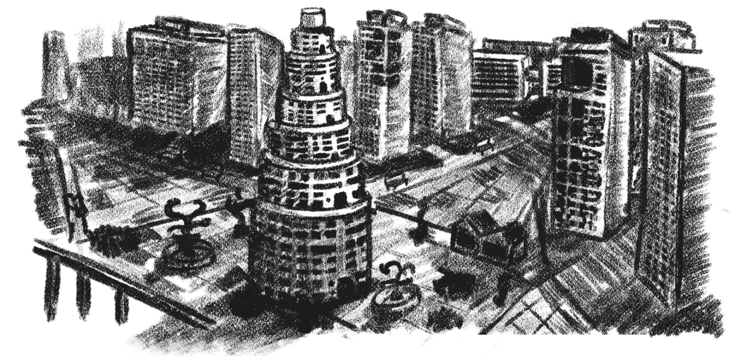 С крыши действительно было, на что посмотреть. Прямо перед ними возвышалась цилиндрическая башня в сорок уровней высотой. Начиная с десятого, каждые следующие пять уровней были немного уже предыдущих в диаметре, и каждый такой переход отмечала открытая площадка-балкон с высоким парапетом. Башня располагалась в центре громадной прямоугольной площади, мощеной крупной плиткой разных оттенков голубого и серого. Видимо, полное впечатление узор, в который она была сложена, мог произвести только с верхних секций центральной высотки – настолько масштабным он был. По площади в хаотичном порядке были разбросаны футуристические скульптуры в два-три человеческих роста; фонтаны, похожие на кляксы и абракадабры, что создаются карандашом в полной сырого энтузиазма детской руке; частично крытые павильоны, лавки и столики под ломаными навесами; борозды электротротуаров… И никаких автомобильных дорог. Никаких рельс, никаких столбов с проводами, никаких знаков – только бесконечно тихая, пустынная площадь. Квадраты поросшей травой земли торчали зелеными островками в плиточном море – очевидно, их собирались засадить деревьями, разбить клумбы, но в итоге передумали.
