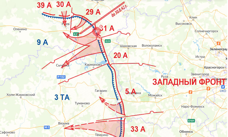 Противостояли этим двум армиям две дивизии Вермахта – 36 моторизованная и 161 пехотная. Войска Красной Армии, сосредоточенные на этом участке фронта, многократно превосходили противостоящие силы Вермахта во всех отношениях. Но, в отличие от 20-ой и 31-ой армий, сформированных вторично в октябре-ноябре 1941 г., после Вяземской катастрофы, эти две немецкие дивизии обладали большим боевым опытом.