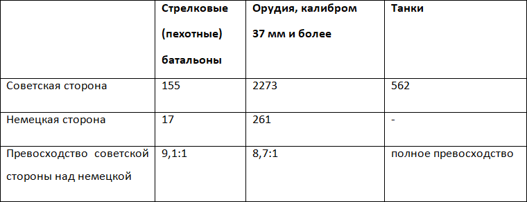 На направлении главного удара превосходство советской стороны было еще больше, что позволило обеспечить следующую плотность сил и средств на 1 км фронта: