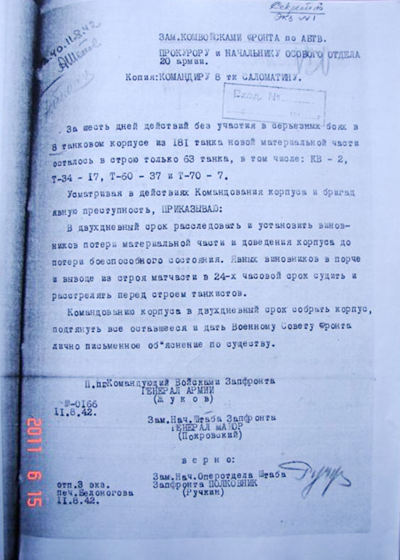 6. Ф.48а, оп.3408, д.112 (Документ Ставки ВГК о нецелесообразности применения импровизированных танковых групп).