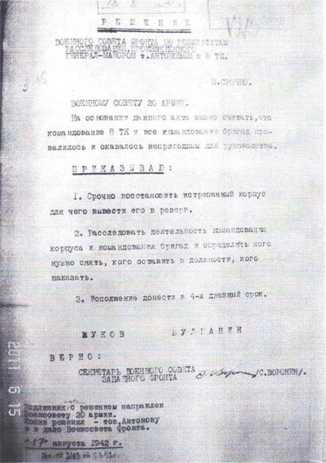 1. С 23.00 5 августа 1942 г. руководство всеми операциями в районе Ржева возложить на командующего Западным фронтом генерала армии тов. Жукова.