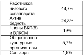 В начале 1929 года, как и в прошлые годы, жертвами кулацкого террора чаще всего становились: «работники низового соваппарата (95 фактов), актива бедноты (94 факта), члены ВКП(б) (один факт) и ВЛКСМ (54 факта)»[60].