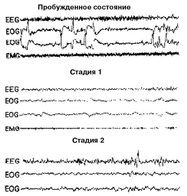 Стадия 1. Альфа-активность уменьшается. Активация редкая, EEG состоит в основном из низковольтной активности смешанной частоты в диапазоне 3–7 Гц. EOG отсутствует, но наблюдаются медленные движения глазных яблок. EMG – от умеренного до низкого.