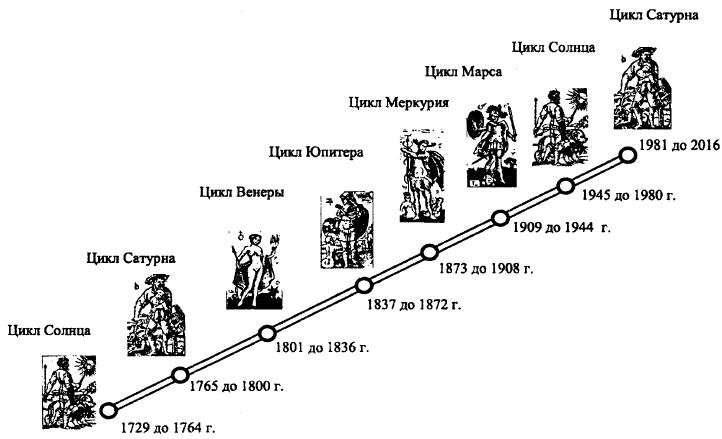 Планетарные годы чередуются в той же последовательности, что и планетарные часы, то есть по периметру Звезды Магов. Например, 21 марта 1986 года начался год Сатурна, за ним следовал год Юпитера, 1987, потом год Марса, и т. д. На предыдущей странице приведена таблица, в которой приведены планетарные годы с 1848 по 2006. Эту таблицу можно продолжить в любом направлении, заметив, что номера годов одной и той же планеты отличаются друг от друга на 7 пунктов.