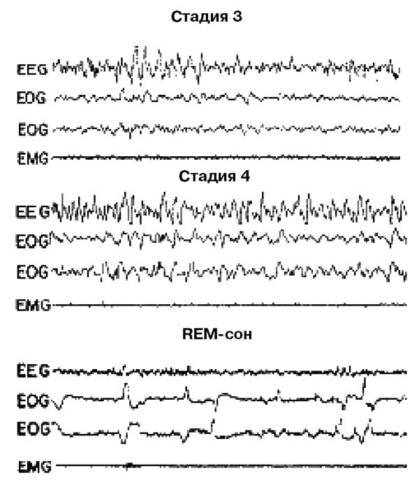 REM. EEG возвращается к низковольтному узору смешанной частоты, похожему на узор стадии 1. Появляются вспышки быстрых глазных движений. Фон EMG виртуально отсутствует, но на этом фоне могут наблюдаться многочисленные небольшие подрагивания мышц.