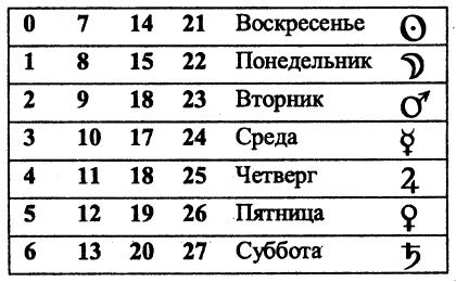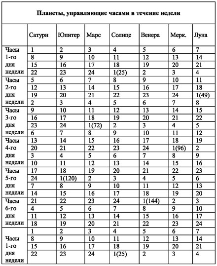 Если теперь прибавлять к единице разное число семерок (7, 14, 21), то окажется, что Сатурн управляет: для 1-го дня – 1, 8, 15, 22-м часом; для 2-го дня – 5, 12, 19-м часом и т. д. Аналогично и для других планет. Вторым часом 1-го дня, как нетрудно видеть, управляет Юпитер. Ему же достались: из 1-го дня – 2, 9, 16 и 23-й часы; из 2-го дня – 6, 13, 20-й и т. д.