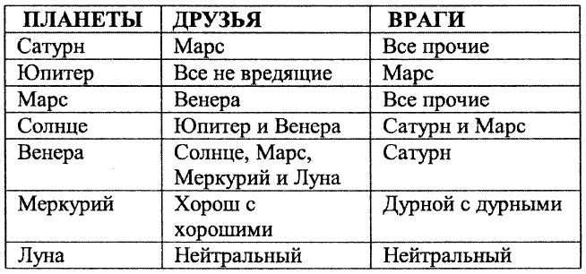 Таблица планет дружелюбных и враждебных