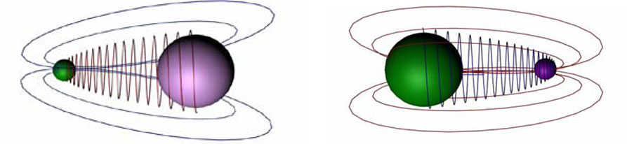 В фазовом объёме на полволны непрерывно происходит изменение магнитного поля от монопольного (слева) одного знака через дипольное (посредине) к другому монопольному (справа), но другого знака. На фиг. 2.7 средняя позиция демонстрирует мгновенное состояние симметричного диполя (розовый двухполюсный торроид) при положении 1/8 первичного моноля от начала фазового объёма, а вторичного монополя на соответствующем расстоянии в 3/8 длины волны. Во всех других положениях поле между монополями будет ассиметричнымдиполем. А в момент подхода первичного монополя к четверти длины волны внешнее магнитное поле будет целиком определятся полем полностью заряженного противоположного монополя. Главной особенностью взаимодействия двух противоположных монополей является то, что они никогда не сближаются на расстояние меньшее четверти длины волны, а пространство между двумя полюсами, помеченное розовым эллипсоидом, не содержит осевого магнитного поля. В этом пространстве присутствует лишь начало недостроенной вторичным монополем спирали волновода электропотенциалов противоположного знака. Активный объём вихрона размером в четверть длины волны всегда содержит первичный разряжающийся монополь, противодействующий этому процессу электрический монополь, им индуктированный вторичный магнитный монополь и часть спирали волновода, установленной уже вторичным монополем. При переходе на вторую часть полволны вихрон сменяет себя на зеркальный, при этом первичный магнитный монополь исчезает, а возродившийся второй продолжает движение и повторяет создание волновода самодвижущегося фотона с электропотенциалами, но противоположной полярности.