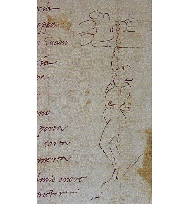 Расписывать потолок Сикстинской капеллы Микеланджело было особенно сложно, поскольку приходилось работать, выгнувшись назад. В письме к своему приятелю Джованни да Пистойя Микеланджело написал шуточный сонет и нарисовал карикатуру на самого себя.