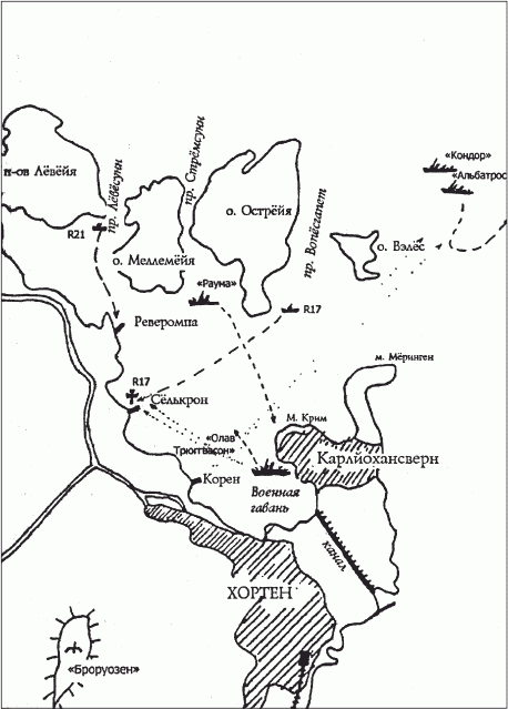 В подчинении морского коменданта базы капитана 1‑го ранга Вигерса имелась группа кораблей. В порту стояли миноносец «Гиллер» и подводные лодки В-2 и В-5, в военной гавани Марвикен – миноносец «Один», сторожевые корабли «Люнгдаль» и «Хваль VII» и выведенный из состава флота миноносец «Дельфин» (водоизмещением 100 т, постройки 1896 г.). На подходах к фьорду дежурили малые миноносцы «Квик», «Люн» (80 т, постройки 1896–1899 гг.) и сторожевые корабли «Хваль IV», «Хваль VI».