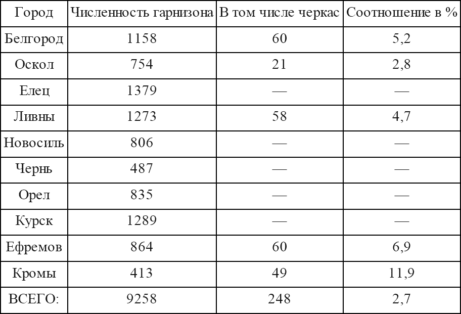 Соотношение черкас и других категорий служилых людей в гарнизонах российских крепостей по росписи 1648 г.