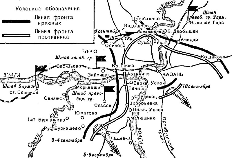 5 сентября в 5 ч. 20 мин. (по московскому времени) красные части получили приказ о наступлении на Казань. К этому моменту Правобережная группа 5-й армии насчитывала 4200 бойцов при 16 орудиях и 55 пулеметах. В Левобережной группе было 4353 бойца, 18 орудий и 58 пулеметов.