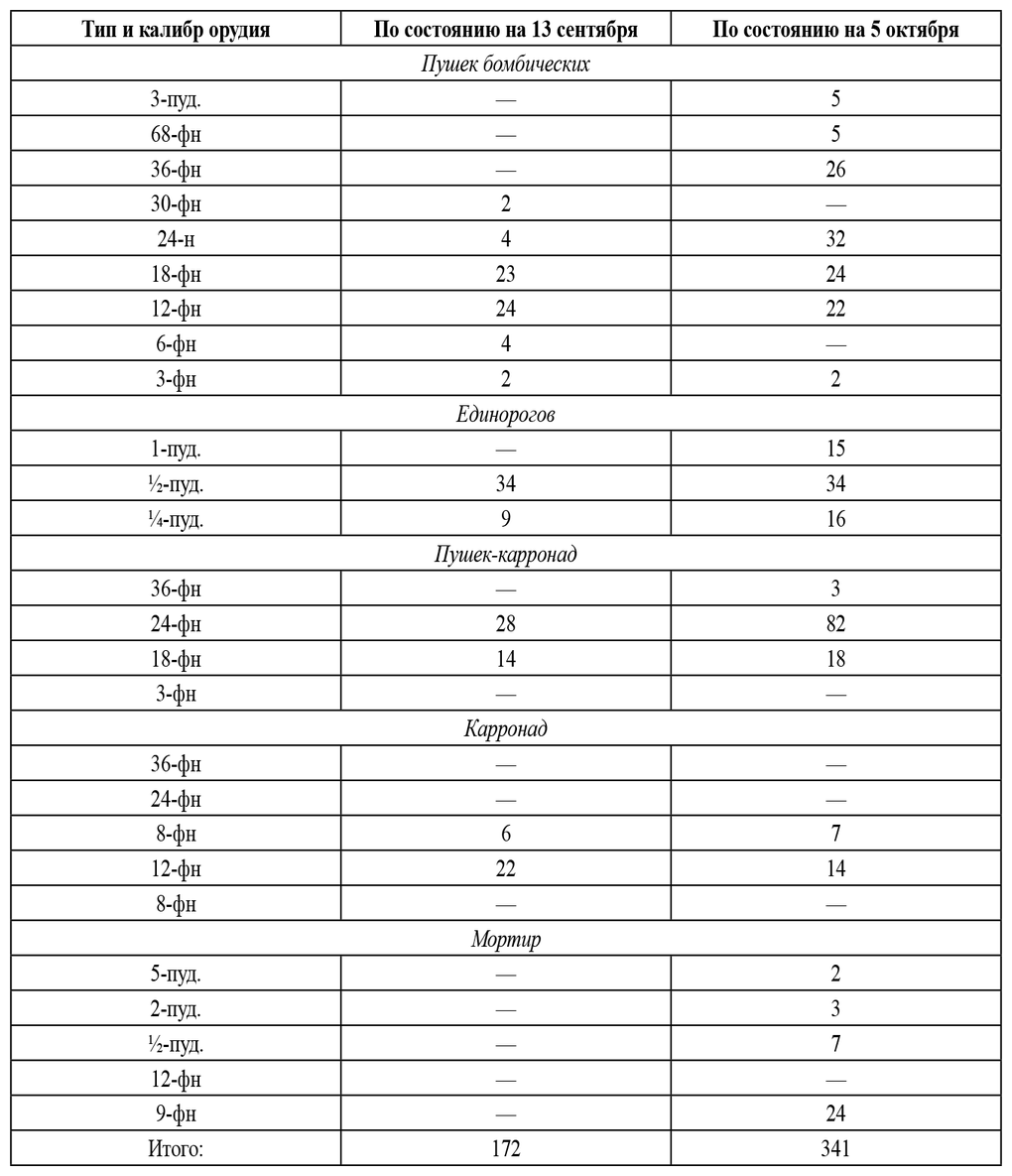 Слабой стороной артиллерии обороны была необеспеченность её мортирами крупного калибра. (К артиллерии крупного калибра отнесены: пушки бомбические и пушки-карронады калибра от 24 фунтов и выше; единороги 1-пудовые и выше; мортиры калибром от 2 пудов и выше). Имевшиеся пять 5-пудовых и 2-пудовых орудий этого типа составляли всего 1,5 % от общего количества артиллерии обороны (5 от 341) и около 3,5 % от общего количества артиллерии крупного калибра (5 от 173).