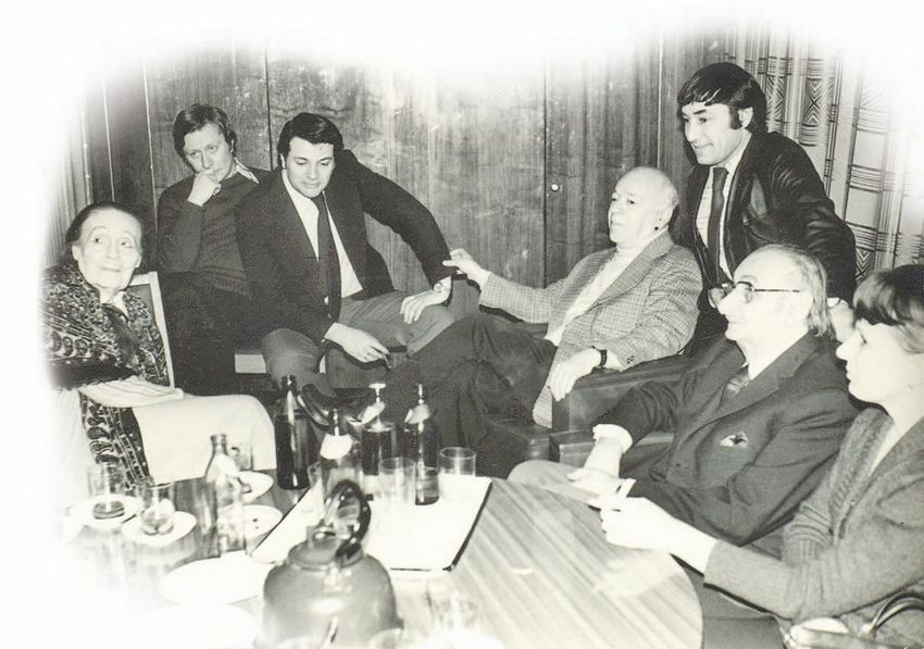 Лиля Брик, Андрей Миронов, я, Валентин Плучек, Спартак Мишулин, муж Лили Брик Василий Катанян и моя супруга Наталия Николаевна в 1977 году в Центральном доме работников искусств