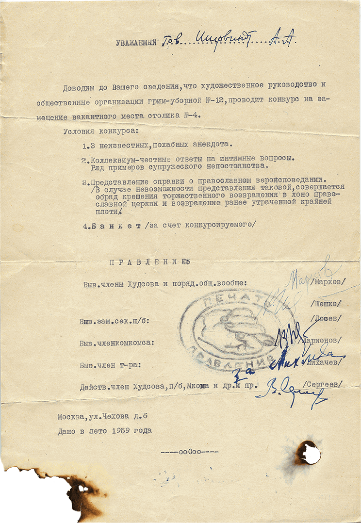 Доводим до Вашего сведения, что художественное руководство и общественные организации гримуборной № 12 проводит конкурс на замещение вакантного места столика № 4.