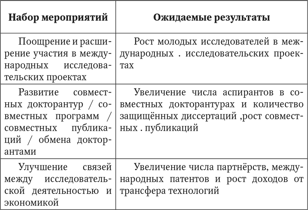В таблице 1 продемонстрирован фрагмент рекомендуемого набора мероприятий и активностей, обеспечивающий эффекты интернационализации в сфере образовательной деятельности.