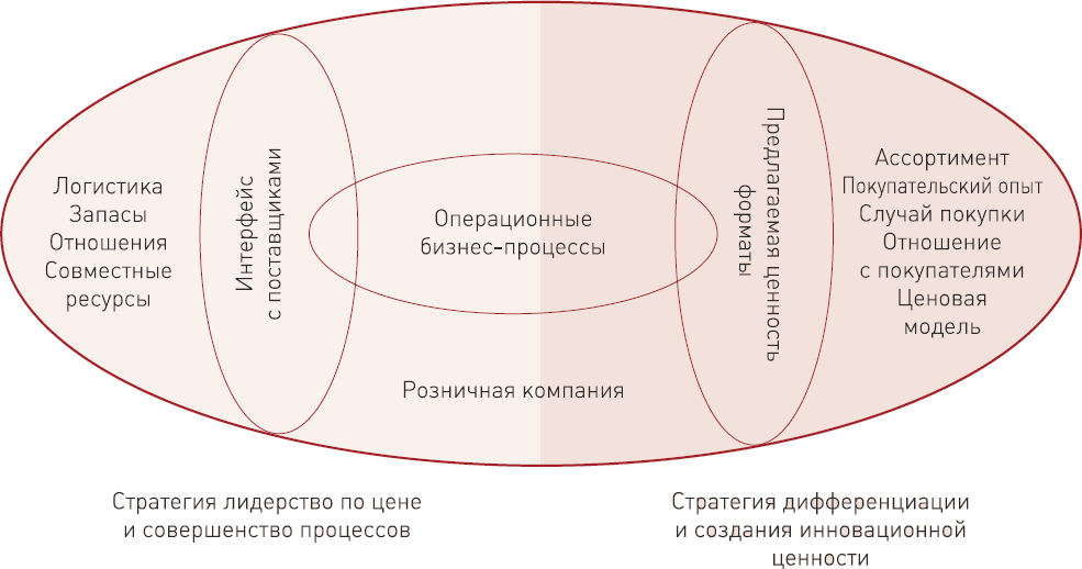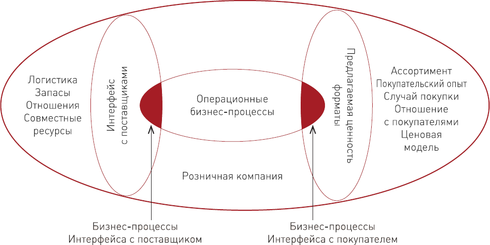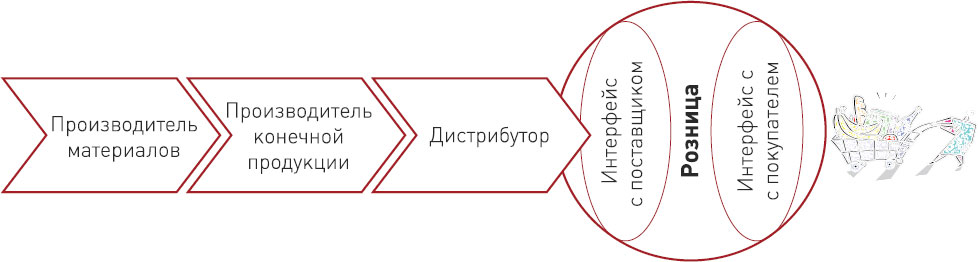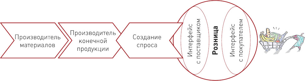 Любая розничная компания может быть представлена как двухсторонний бизнес-интерфейс: с одной стороны – поставщики, с другой – покупатели. Такой подход позволяет взглянуть на нее как на важный, но не единственный элемент в общей цепочке создания ценности для конечного покупателя, в которой также задействованы производители и поставщики, и выделить факторы успеха, в том числе отделить ценность продаваемых товаров от ценности розничной компании.
