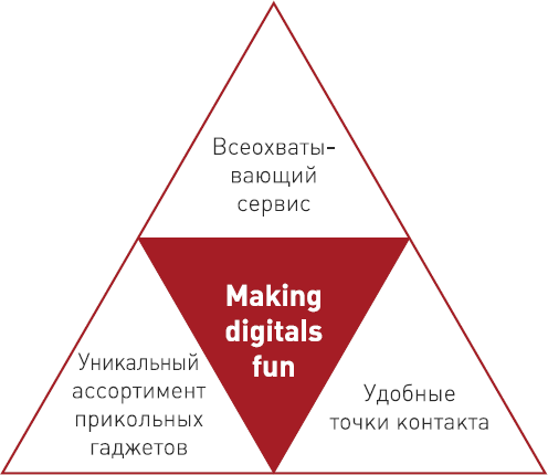 В одном из проектов, который мы делали вместе с моим коллегой из США Роландом Бэргменом для розничной компании, продающей цифровую технику, ключевая предлагаемая ценность и позиционирование компании были сформулировали как «Making digitals fun». Она состояла из трех основных элементов: уникальность ассортимента, всеохватывающий сервис, удобные точки контакта.