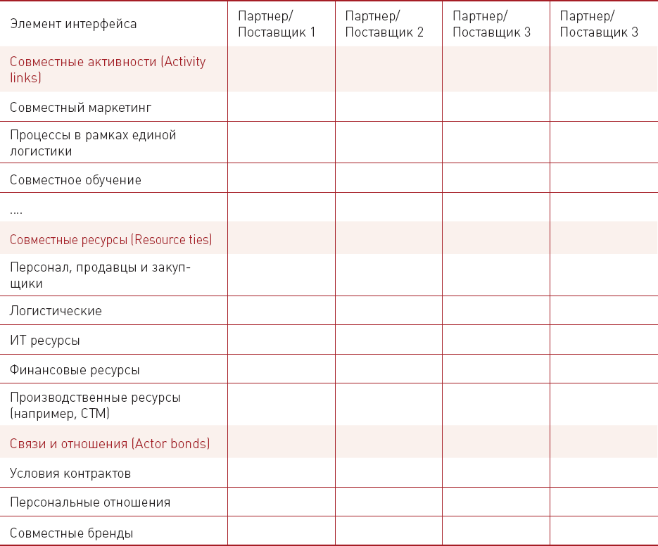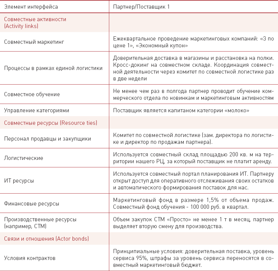 Таким образом, чтобы определить интерфейс с поставщиками, необходимо для каждого стратегического поставщика (партнера) определить эти три области взаимных обязательств, например, с помощью шаблона-таблицы (см. Таблица 3).