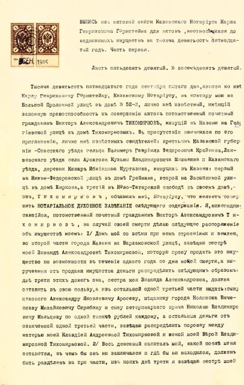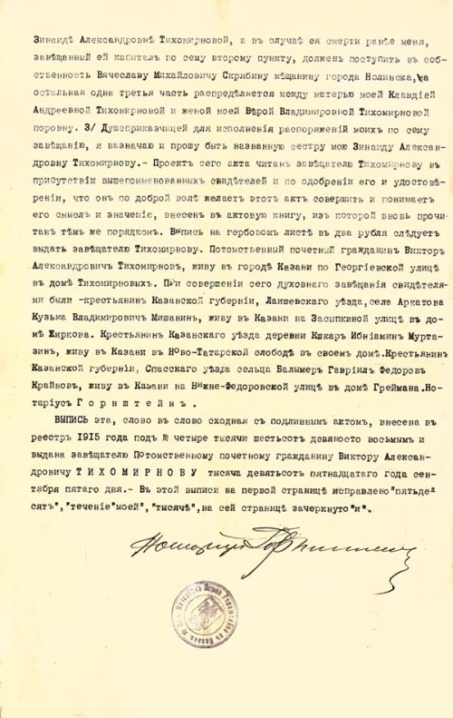 Завещание В. А. Тихомирнова, в котором упоминается В. М. Молотов. 5 сентября 1915. [РГАСПИ. Ф. 82. Оп. 1. Д. 122. Л. 1–1 об.]