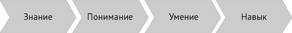 Знание – это состояние, в котором ты владеешь информацией, и не более того. Например, завязывание галстука. Тебе можно дать подробную схему, изучив которую, ты получишь знание, но не более. Когда ты попробуешь и у тебя станет получаться, пускай и кривовато, придет понимание того, как это делается: оно всегда приходит с первым опытом. В результате нескольких повторений ты уже сможешь это делать красиво, но все еще по схеме – это умение. И наконец, твои руки и голова запомнят последовательность, и тогда схема тебе больше не нужна – это навык.