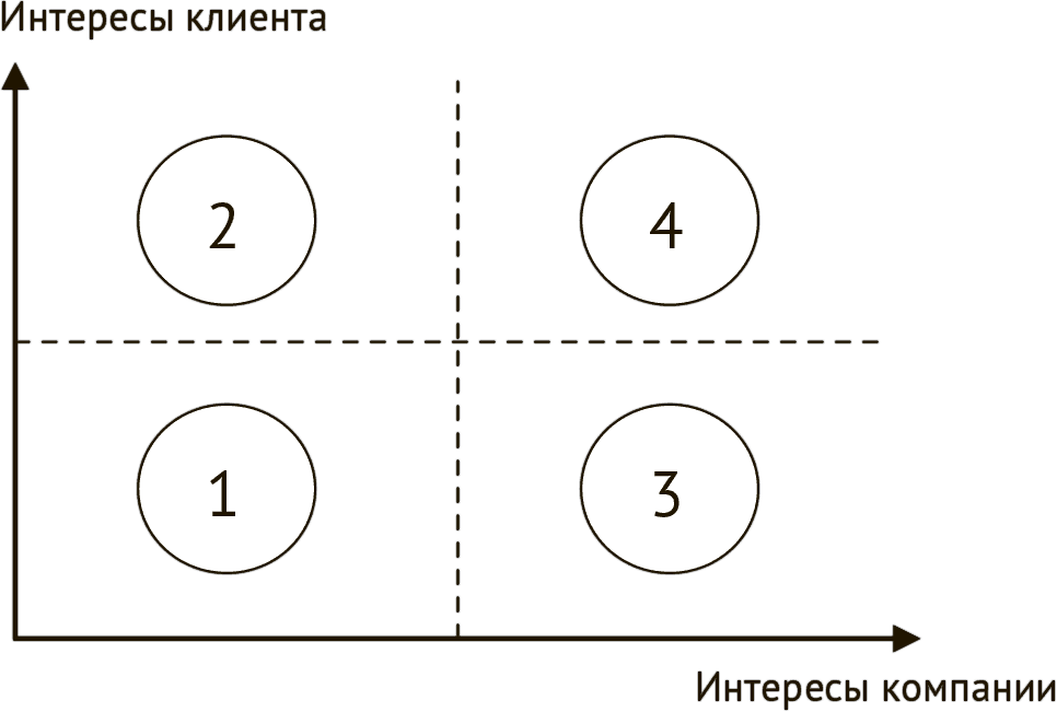 Чтобы разобраться, как же нам заползти в четвертый квадрант, давай сначала рассмотрим, в чем заключается интерес клиента, затем поговорим об интересах компании, а после, в следующих частях, поработаем с конкретными инструментами по достижению максимума по обоим показателям.