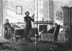 Пушкин ехал скоро, в точности исполняя свою подписку. По донесению псковской земской полиции, 9 августа он уже прибыл в Михайловское, где его ожидали близкие– отец, мать, брат и сестра. Но нерадостна была встреча опального сына с родителями, не видавшими его несколько лет. Трусливому отцу Пушкина и легко воспламеняющейся его супруге сделалось страшно и за самих себя, и за остальных членов семьи при мысли, что в среде их находится опальный человек, преследуемый властями, к тому же за атеизм. С ужасом смотрели они на дружбу поэта с младшим братом и сестрою, опасаясь, что он и их совратит в безбожие. Между тем начальник края, маркиз Паулуччи, поручил уездному опочецкому предводителю дворянства, Пещурову, пригласить отца Пушкина принять на себя надзор за поступками сына, обещая, в случае его согласия, воздержаться со своей стороны от назначения всяких других за ним наблюдателей. Сергей Львович имел слабость принять это предложение, и, что из этого вышло, можно судить по следующему письму Пушкина к Жуковскому, 31 октября 1824 года: