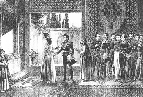 Первое свидание И.Ф. Паскевича с наследником персидского престола Аббас-Мирзою в Дейкаргане 21 ноября 1827 г. (пятый справа – Грибоедов). Гравюра К.П. Бегерова с оригинала В.И. Мошкова, конец 1820-х гг.