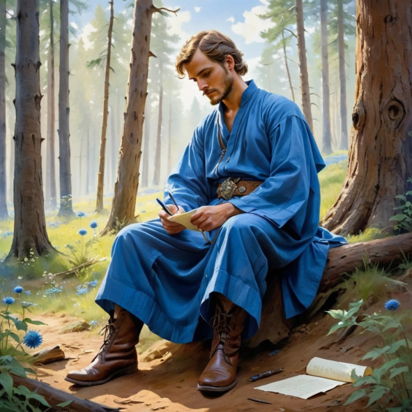 Незнакомец в васильковом кафтане, с листком бумаги в одной руке и гусиным пером в другой, сидел на поваленном ветром