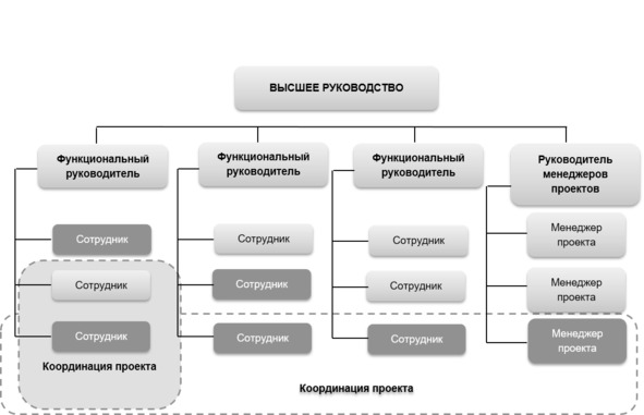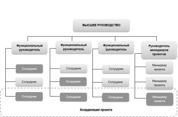 Матричная структура гораздо лучше подходит для проектной деятельности, чем функциональная, и позволяет повысить эффективность работы с проектами. Суть любой матричной организационной структуры состоит в двойном подчинении – каждый сотрудник компании, участвующий в проектах, подчиняется не только своему функциональному руководителю, но и руководителям тех проектов, в которых он задействован.