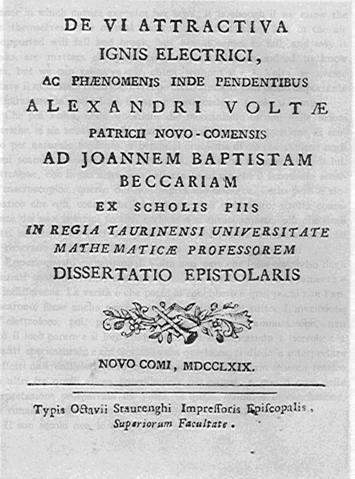 18 апреля 1769 года Вольта публикует свои первые научные мемуары «De viattiva ignis electrici, ac phænomenis inde pendentibus», в которых он отстаивает «официальную» интерпретацию электрических явлений, поддержанную профессором Туринского университета Джованни Баттистой Беккариа.