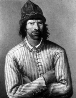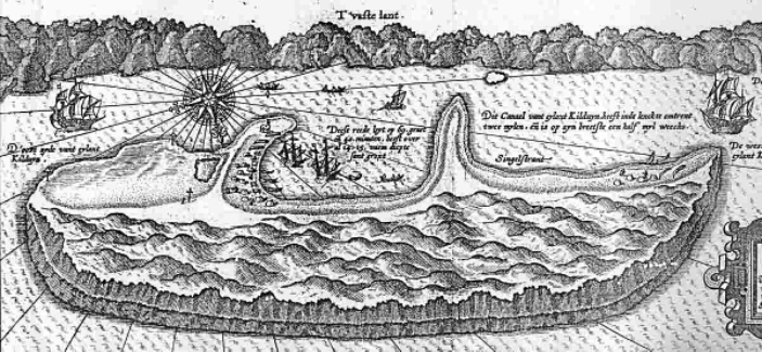 Карта острова Кильдин из книги Яна Гюйген ван-Линшотена «Первое путешествие Гюйген ван-Линшотена с севера через пролив Нассау у устью реки Оби на Вайгач в 1594 году» с изображением русской ладьи (посередине, в верхней части рисунка) с флагом на мачте. Считается одним из наиболее ранних подтверждений того, что русские суда ходили под своим флагом