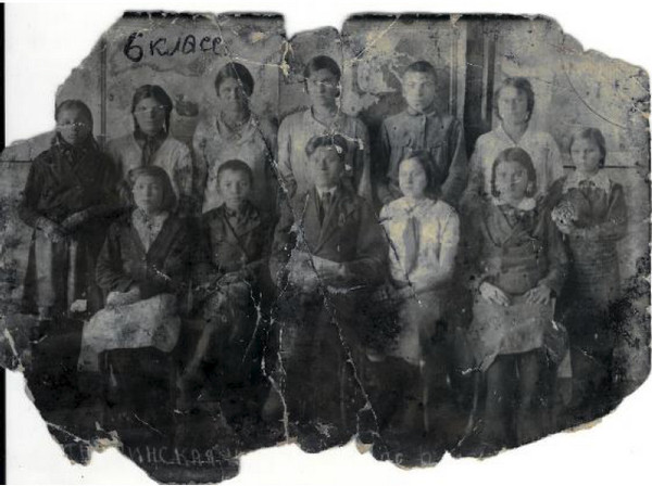 Степнинская школа. 6-й класс. 1941 год. Верхний ряд (слева направо): Демина Зоя, Пименова Нина, Васильева Вера, Кобякова Мария, Пьянков Егор, Воронина Анна; нижний ряд: Ильина Зоя, Кайгородов Михаил, Мирзоятов Григорий Маркович, Латмарина Александра, Смольникова Елена, Мельникова Александра
