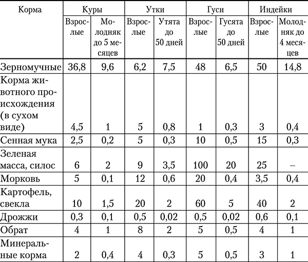 В табл. 1 приведены примерные нормы потребности птиц в кормах за год.