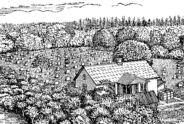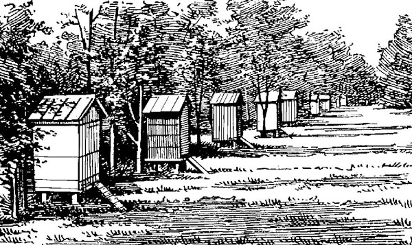 Кустарники и плодовые деревья, посаженные на пасеке, существенно снижают скорость ветра, одновременно служат хорошими ориентирами для пчел и маток, а в полдень затеняют ульи от лучей солнца (рис. 4, 5). В стороне от пасечной площадки размещают производственные (подсобные) постройки.