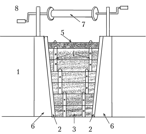 Щитовой водослив в водоемах с эффективным ручьевым водоснабжением: 1 – дамба; 2 – направляющие полозья для подпорных щитов; 3 – водоподпорные щиты; 4 – металлические пластины с петлями для крепления; 5 – каркас с сеткой, которая предотвращает выход рыбы; 6 – бетонная основа водослива; 7 – съемный барабан для поднятия водоподпорных щитов; 8 – пруд