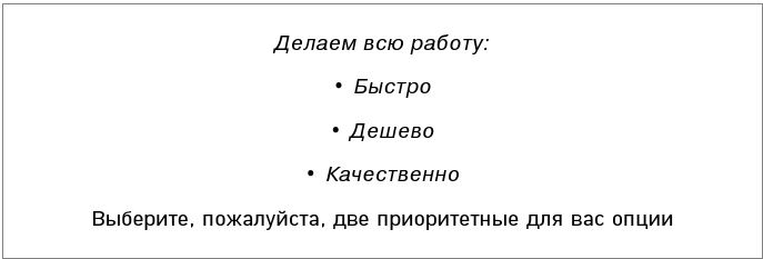 Треугольник же демонстририрует, что при ограниченных ресурсах, двигаясь к одной из задач, мы на то же расстояние отдаляемся от другой задачи. Попытавшись реализовать все три задачи одновременно с одинаковой отдачей, мы остановимся посреди треугольника, так и не достигнув ни одной. Позвольте проиллюстрировать эту ситуацию профессиональным анекдотом-былью из арсенала проектных менеджеров.
