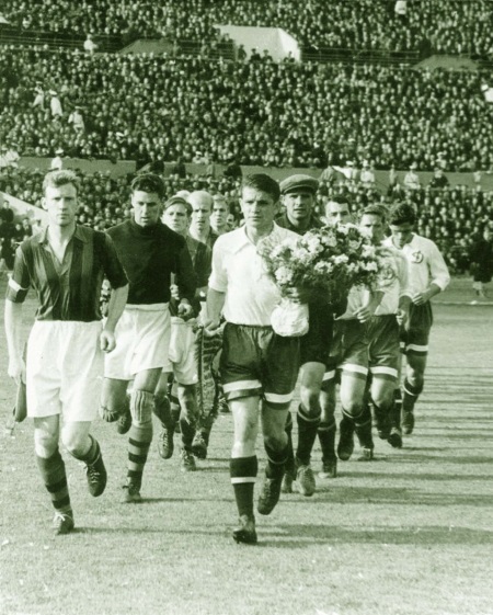 Первый международный матч за «Динамо» против шведского «Юргордена» в Москве 22 июля 1953 года (4:2) Команду выводит на поле К. Крижевский, за ним – Л.Яшин