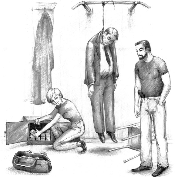 Уже опьяневший и испуганный, Смирнов послушно стал надевать кинутую ему одежду. Как только он оделся, Сергей схватил его за руку и подтащил к турнику, быстро закинул верёвку через перекладину и туго затянул её на шее Смирнова. Верёвка была достаточно прочной, чтобы выдержать человека весом 100 килограмм. Уже совсем опьяневшего Смирнова Сергей поставил на стул.