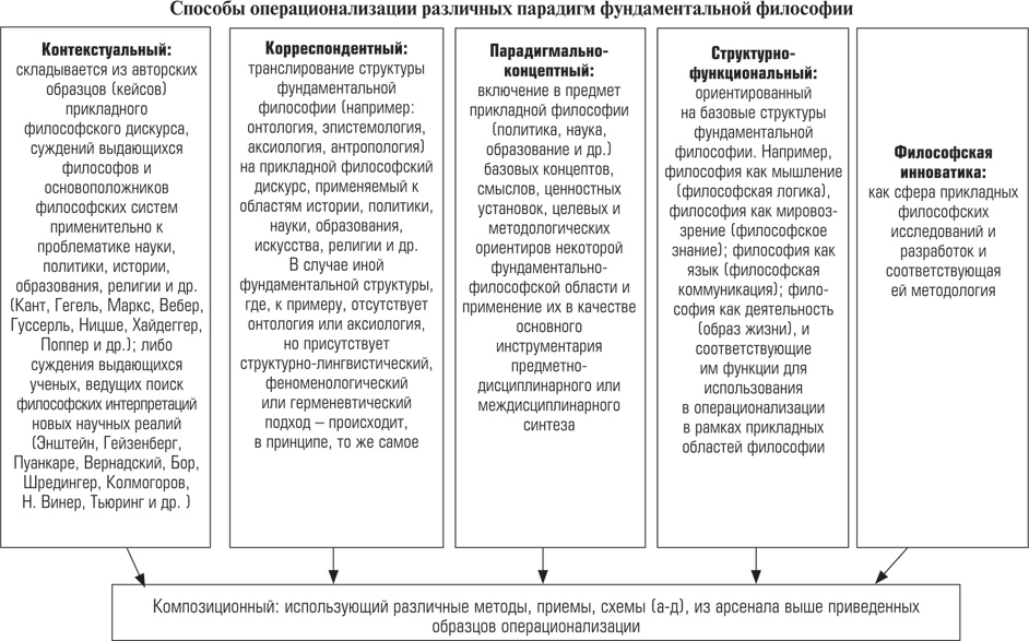 Что касается способов перехода от различных фундаментальных философских парадигм к прикладным философским их версиям, то это крайне непростая процедура. Она более или менее прояснена в современных концепциях диффузии инноваций[37]. В нашем представлении обобщенно-схематически данные процедуры «прикладывания» выглядят применительно к философии следующим образом (см. схему 2).