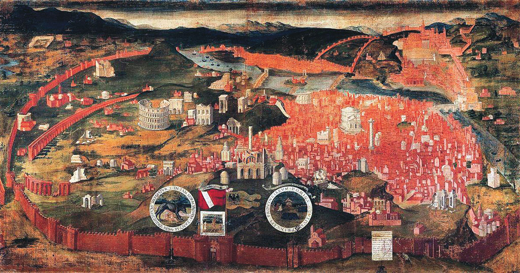 Хорошо видны прославленные римские древности: Колизей и арка Константина, колонна Траяна и термы Диоклетиана, статуи Диоскуров на Квиринале, Пантеон и колонна Марка Аврелия, базилика Св. Петра и мавзолей Адриана