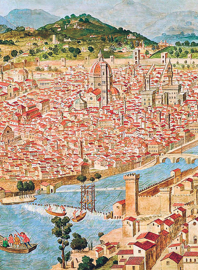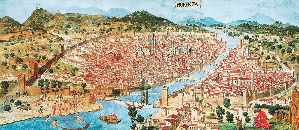 В центре собор Санта-Мария дель Фьоре, кампанила и баптистерий, на полпути от собора к реке Арно – палаццо Веккьо; на противоположном берегу, над фигурой художника, церковь Санта-Мария дель Кармине