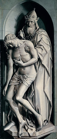 Благодаря небольшим размерам диптиха, в «Троице» мы охватываем единым взглядом такие ракурсы сени, трона, пьедестала, которые, будь фигура Христа приближена к росту человека, пришлось бы воспринимать, глядя то вверх, то вниз, но не видя всего одновременно. Группа находится так близко к зрителю, что до нее можно было бы дотянуться, – однако, видя всю Троицу разом, мы чувствуем непреодолимую дистанцию между собой и небесным престолом. Соединив несовместимые эффекты ближнего и дальнего зрения, Флемальский мастер обособил Святую Троицу от пространственных отношений, которыми мы связаны с обычными вещами.