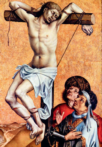 Когда сосуды, в сцене у камина символизирующие чистоту Девы, в закрытом складне совмещаются с жертвенными мотивами «Троицы», то они наводят на мысль об очищении, предшествующем принесению жертвы: Марии суждено пожертвовать собственным Сыном. В подтверждение этой мысли фигуры Марии и Спасителя слагаются в композицию Пьеты. Соединяется содержимое потира (в руке аллегории Церкви) и кувшина, и наше воображение устремляется к Голгофе: «Один из воинов копьем пронзил Ему ребра, и тотчас истекла кровь и вода»[36]. Таким образом, движение Младенца Христа слева направо знаменует возвышение Церкви ценой его жизни. Взглядом своим Он обращается к Отцу: «Вот, иду исполнить волю Твою, Боже»[37], – и в «Троице» ответный взор Бога Отца сулит Сыну воскресение, возвращение в небесный отчий дом.