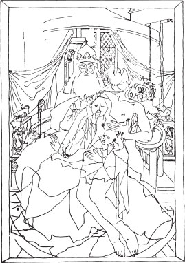 Возникает искушение закрыть складень, чтобы, проникая взглядом сквозь его расписанную под мрамор оборотную сторону, посмотреть, не являются ли все эти соответствия знаками еще более интимного родства двух картин. Смотреть надо от «Троицы» на «Мадонну», а не наоборот, потому что Троица символически выше Девы Марии. Поскольку зритель, как и Бог из «Троицы», глядит на Марию спереди, то в сцене у камина левая и правая стороны сохраняют, соответственно, символику «низшего» и «высшего» начал; в «Троице» же, где все представлено в божественной перспективе, левое и правое символически меняются местами: левое – «высшее», правое – «низшее».
