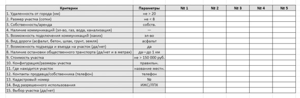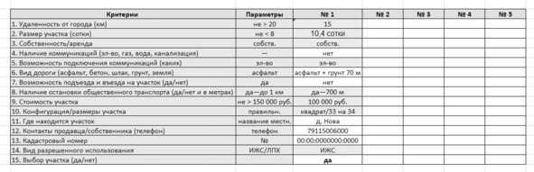 С такой таблицей удобно выбирать будущий участок, просто установив свои параметры во втором столбце. А затем, обзванивая продавцов, вносить данные по каждому подходящему участку. Но имейте в виду: всю информацию от продавцов необходимо тщательно проверять!