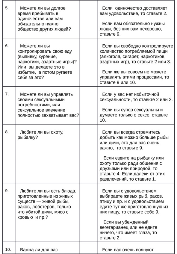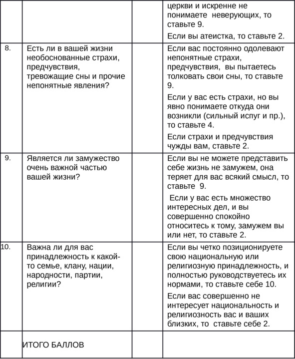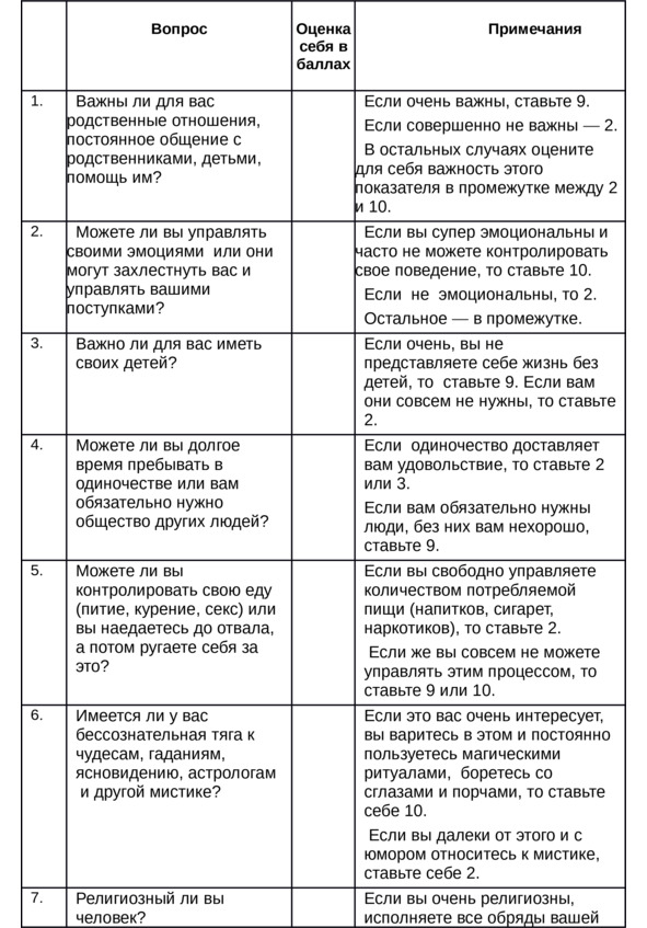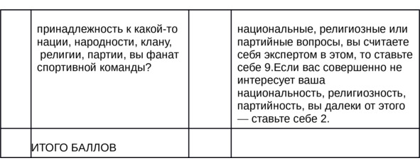 Теперь просуммируйте свои ответы из среднего столбца «Оценка себя в баллах». К полученной сумме прибавьте 10 баллов (это систематическая ошибка). Полученная сумма баллов и будет примерным показателем вашей инстинктивности в процентах.