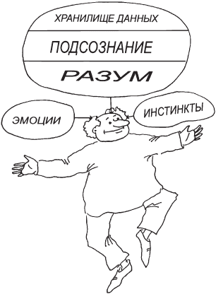 На картинке это может выглядеть так, будто Разум управляет человеком, а информацией из нашего «хранилища данных» его обеспечивает Подсознание.
